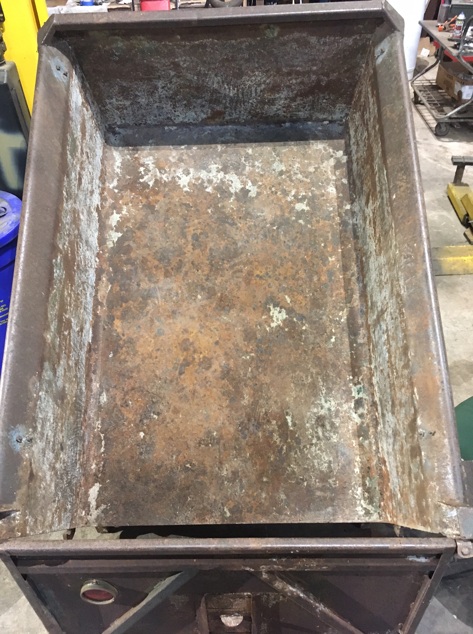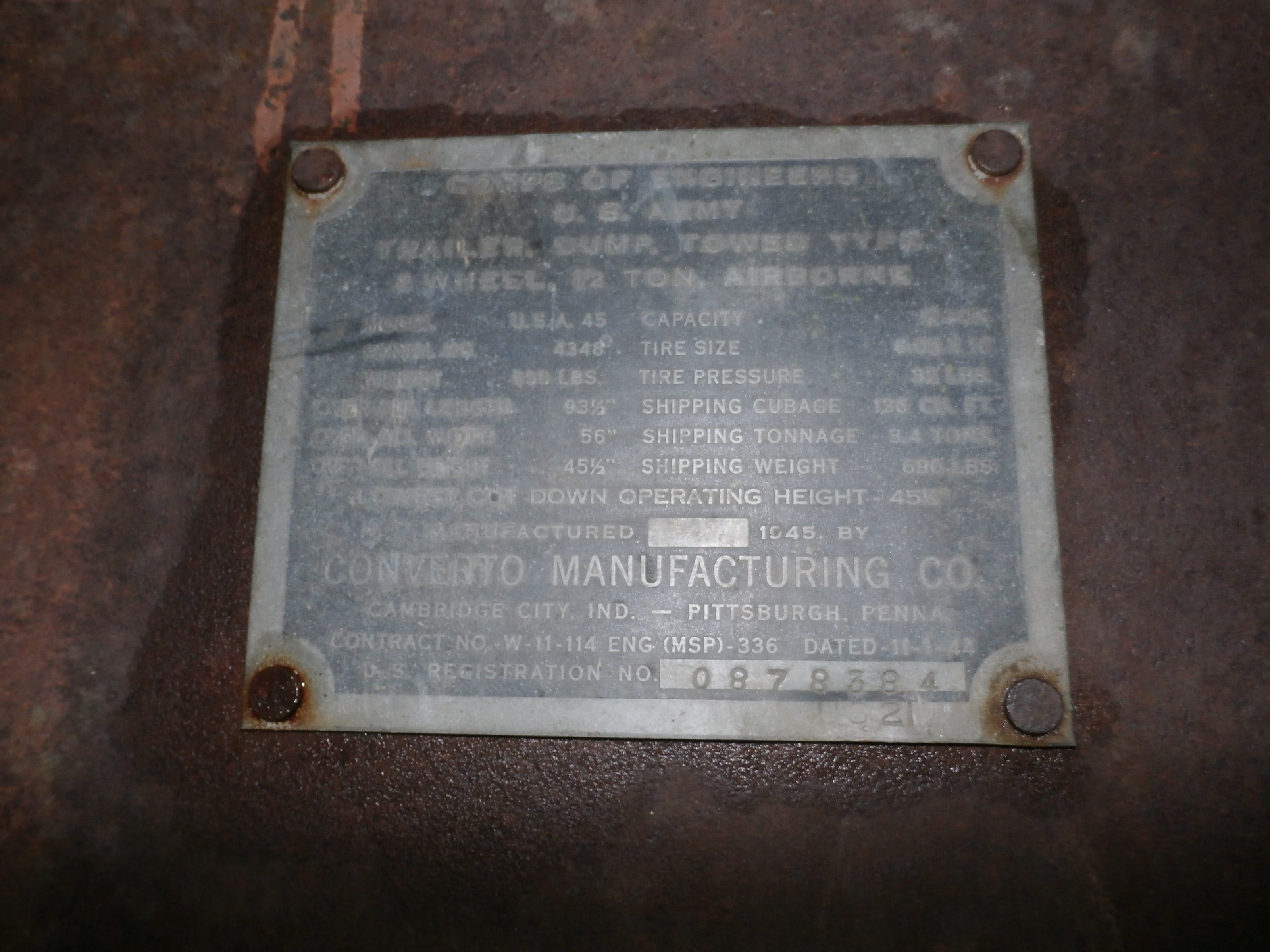 We were in gold country, in central California, hunting for a few things to bring home to the shop when we found this lovely Converto trailer, which is complete down to the last bit, and original. Aside from needing to get the 75 year old dried cement out of the bed, this was a perfect one to restore. It even has both of the original BF Goodrich military issue tires, which are extremely rare. The dump bed is now cleared of the remnants of cement and is totally dent and rust free.