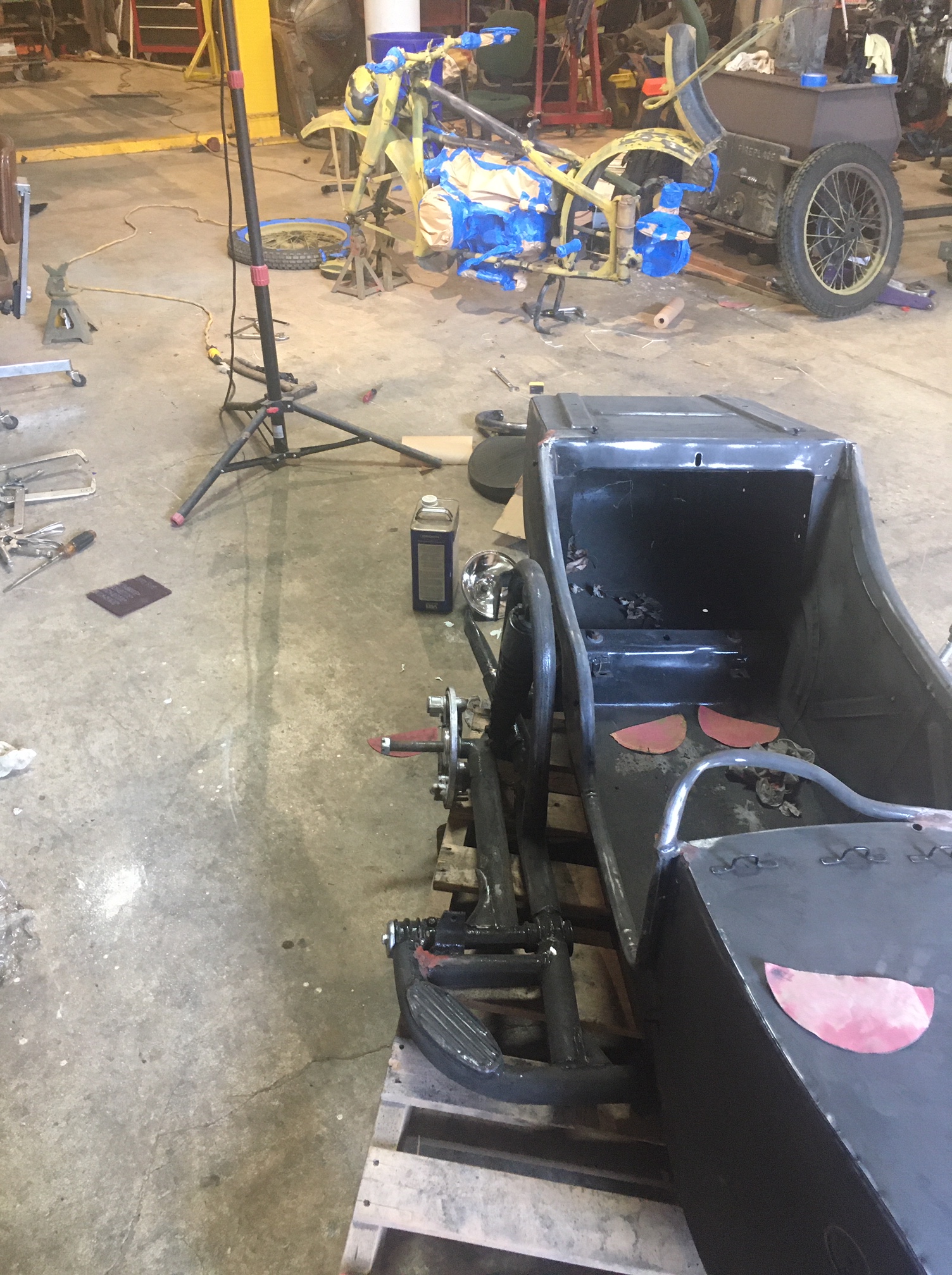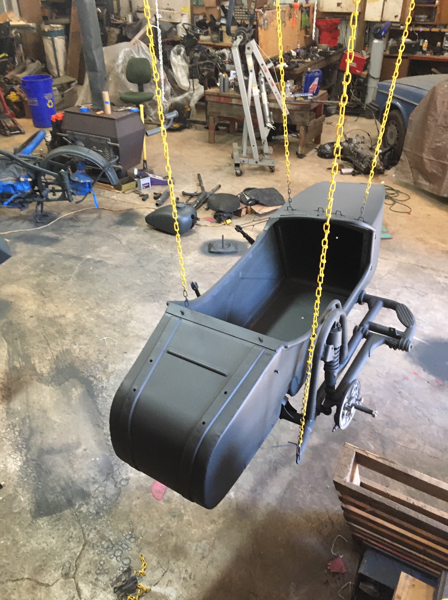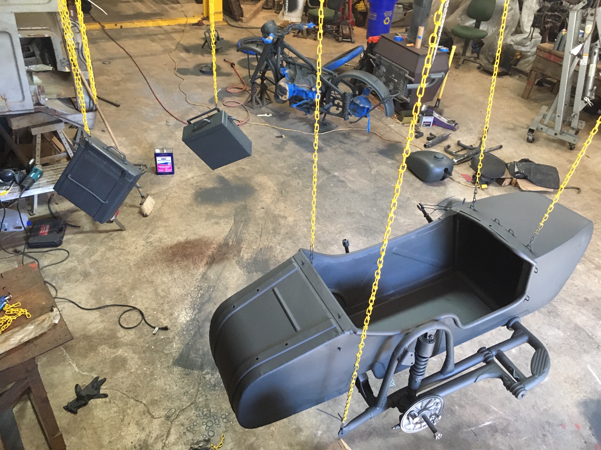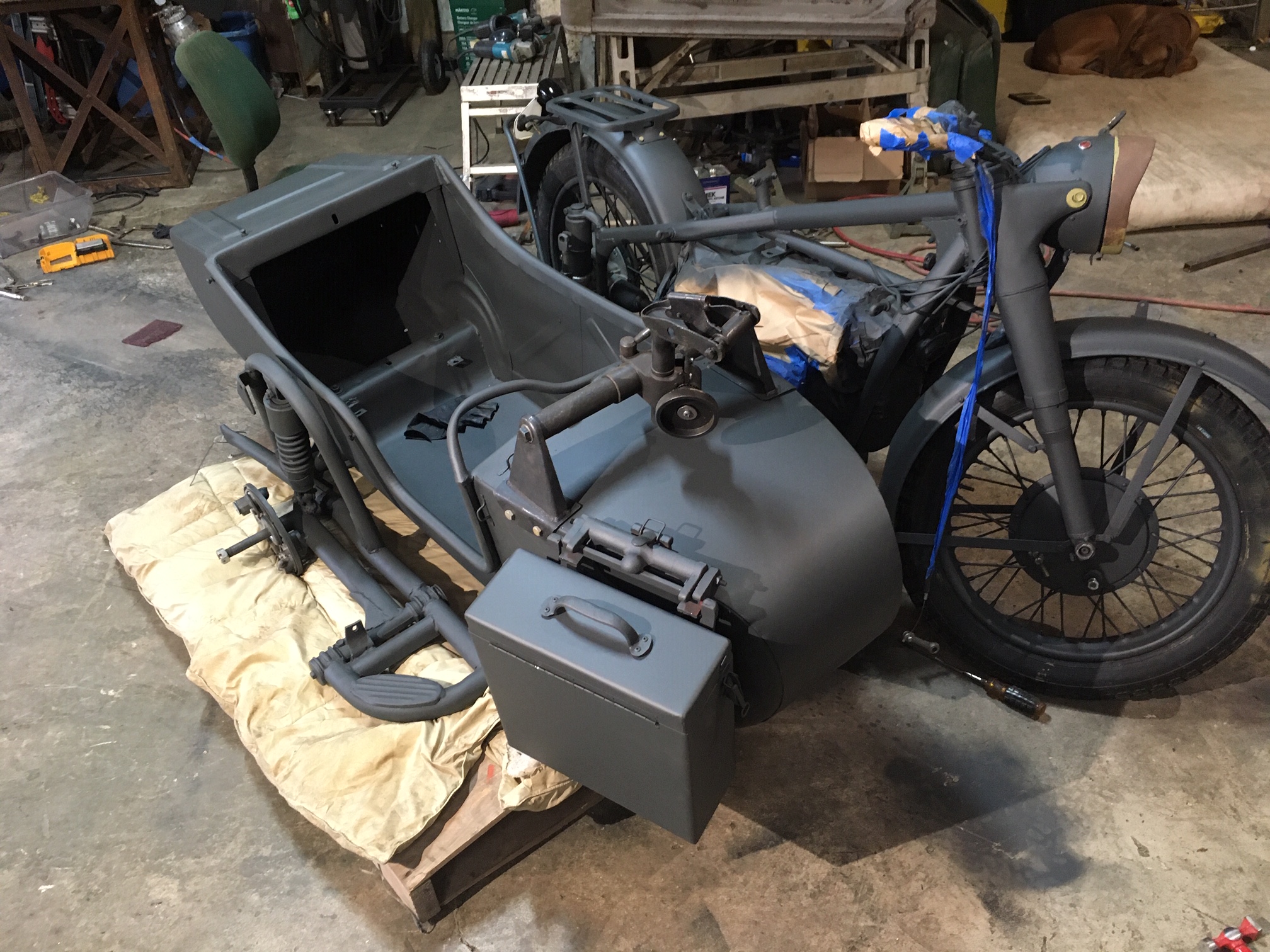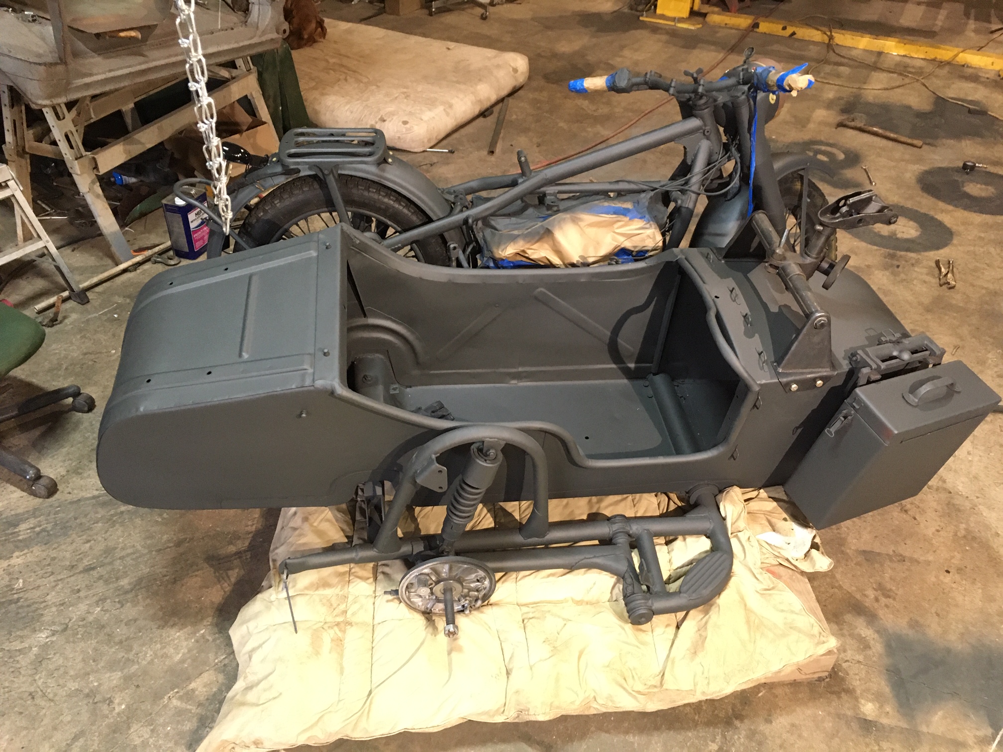 And here, we are re-attaching the side-car to the frame of the motorcycle, with the help of an older padded blanket placed over the pallet for protection of the new paint.