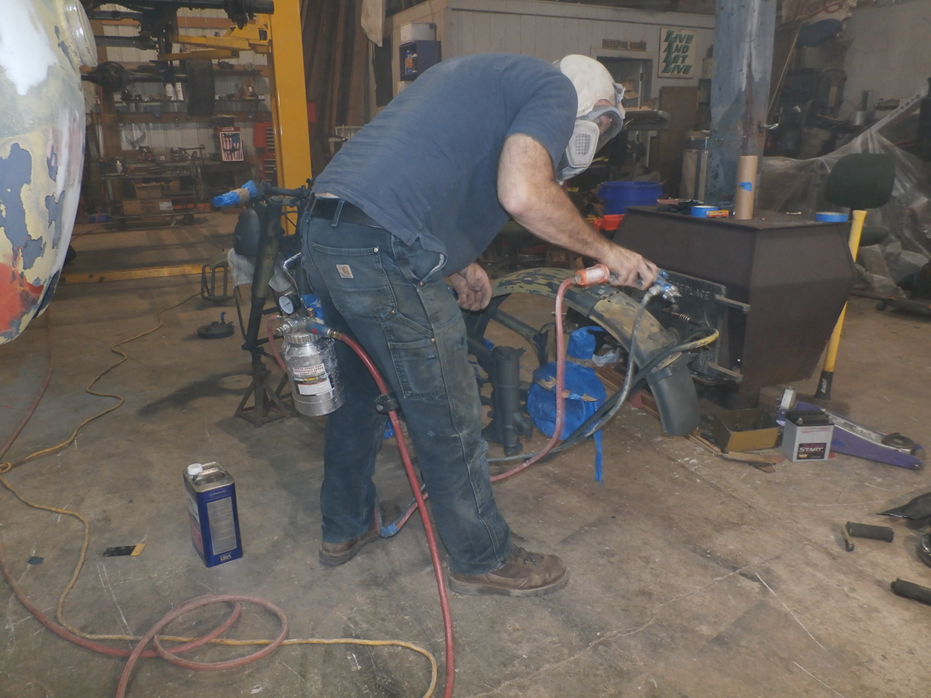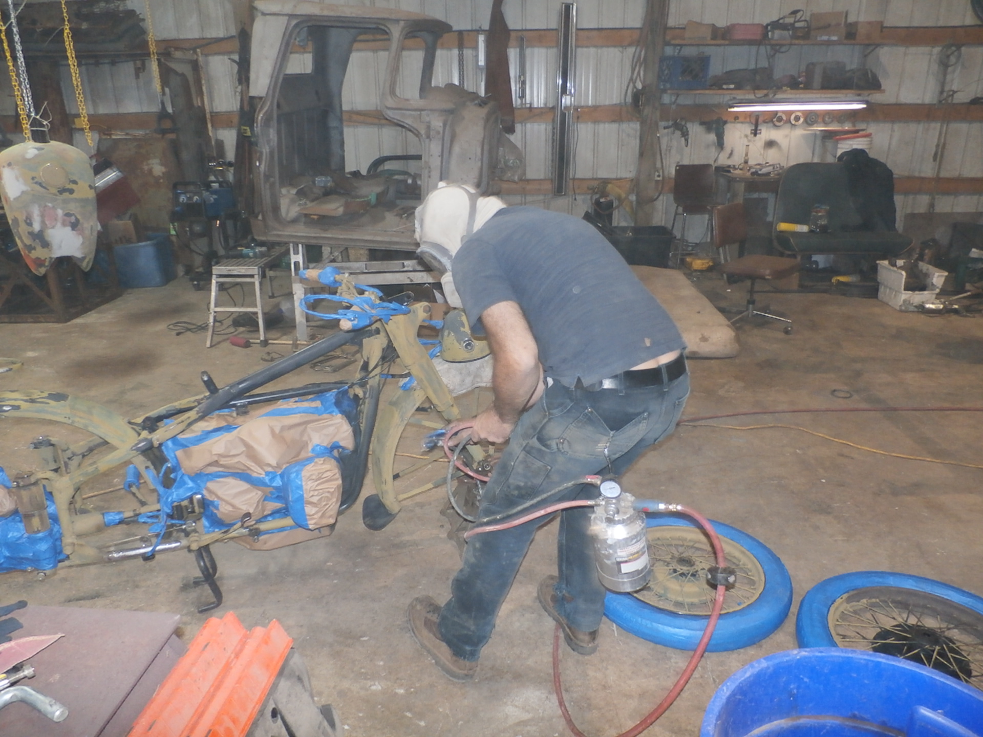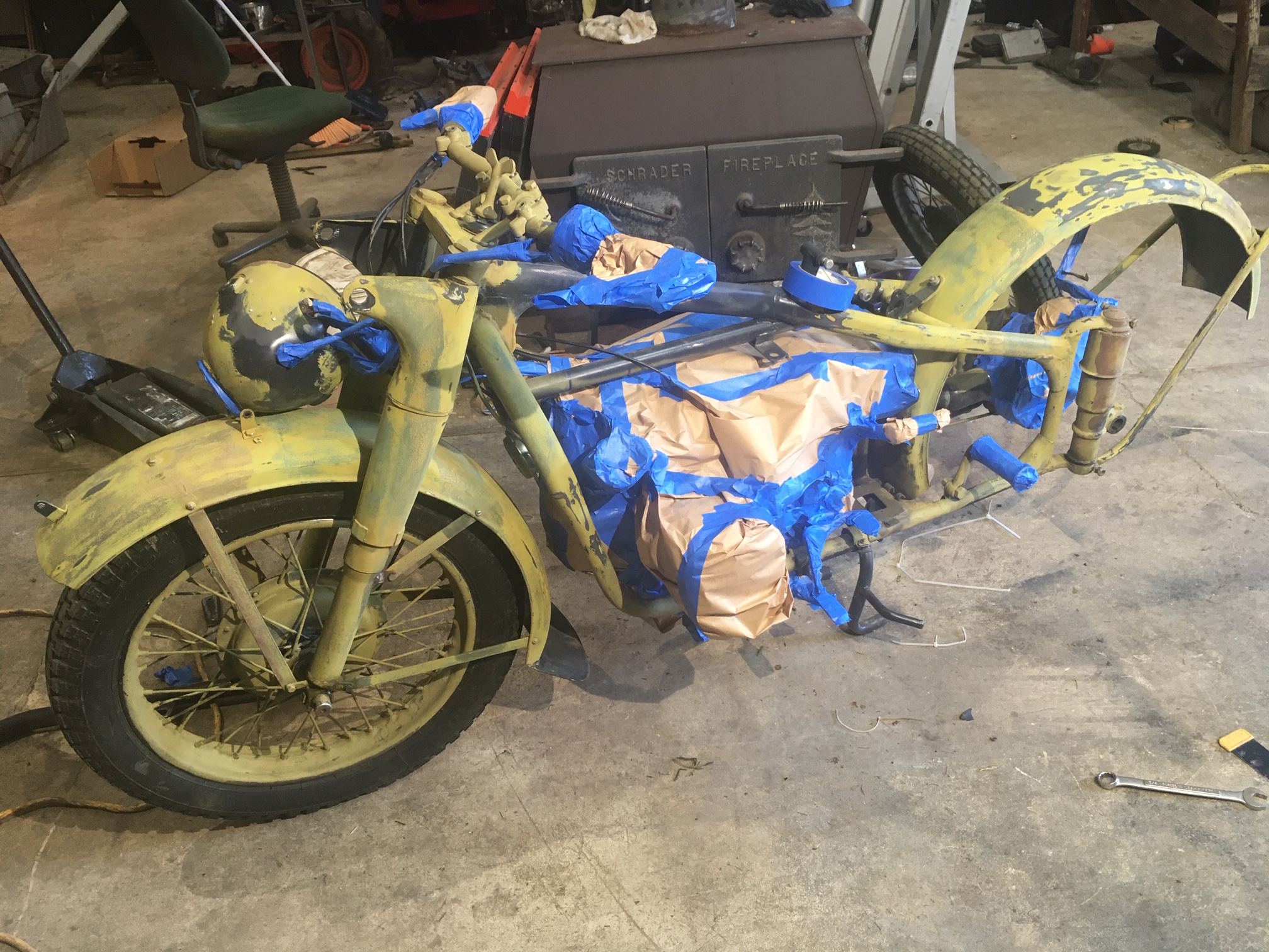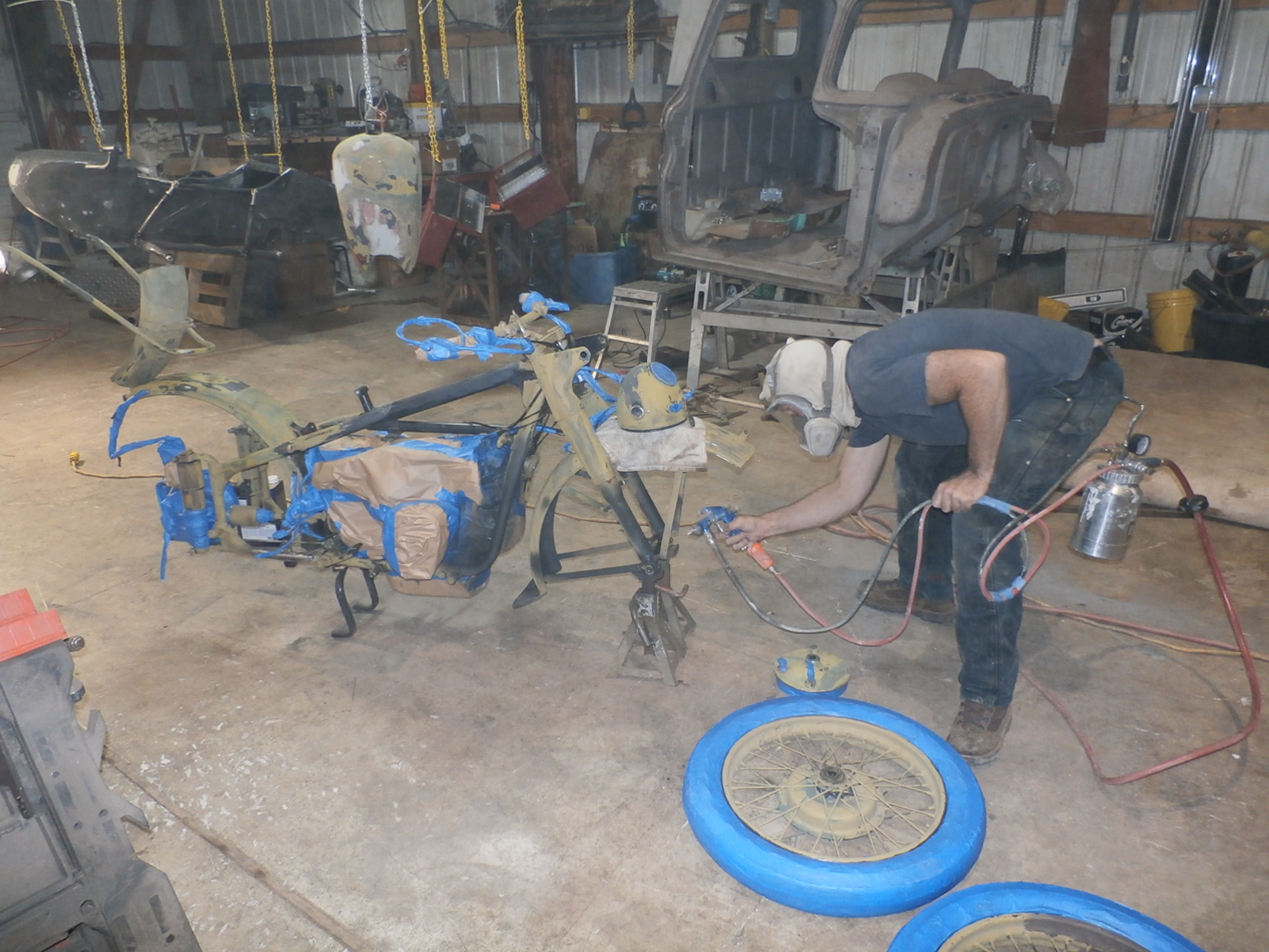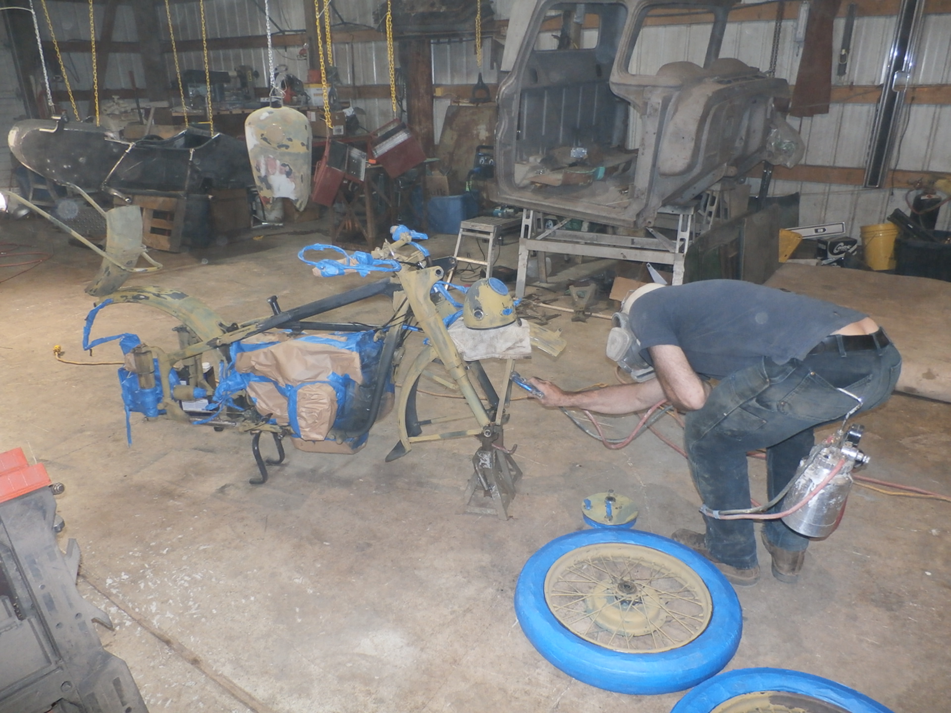 And here, we are re-attaching the side-car to the frame of the motorcycle, with the help of an older padded blanket placed over the pallet for protection of the new paint.