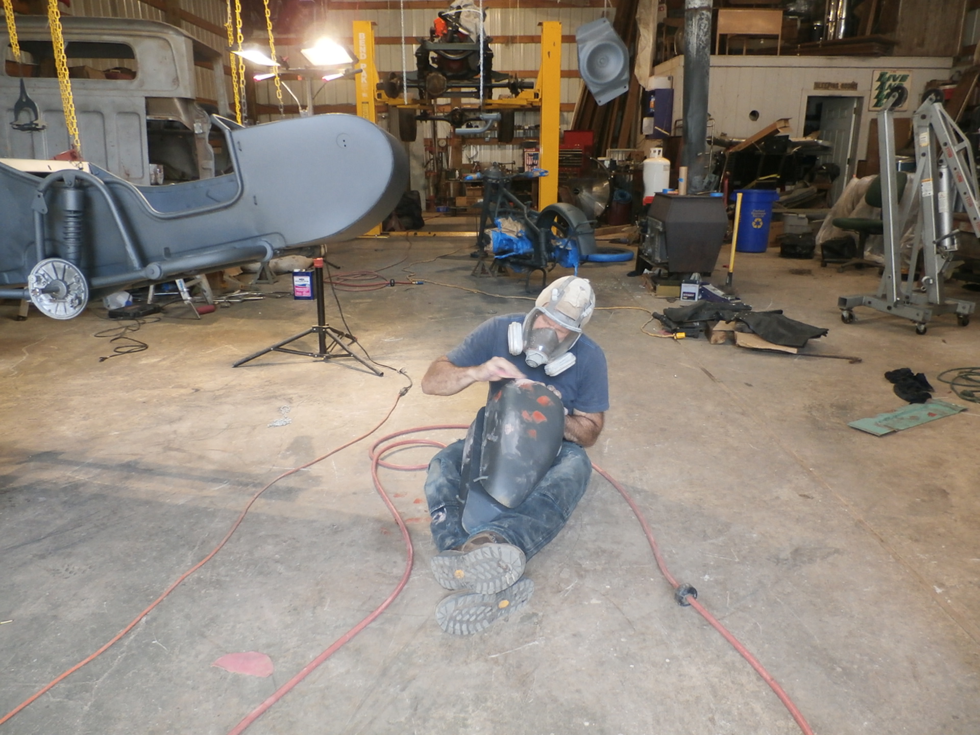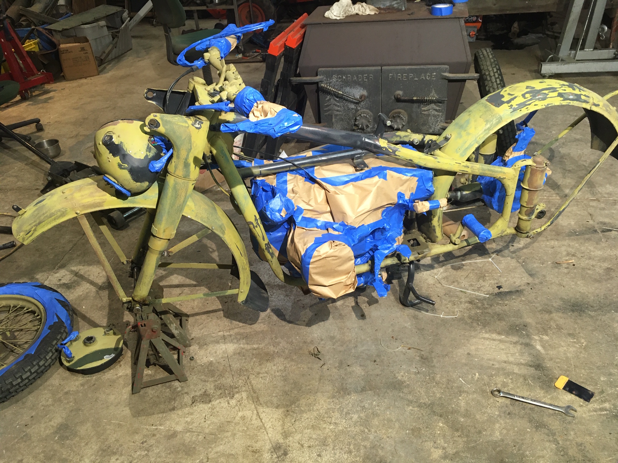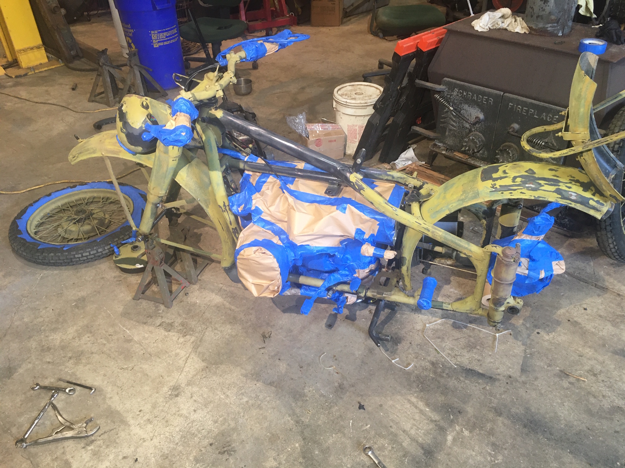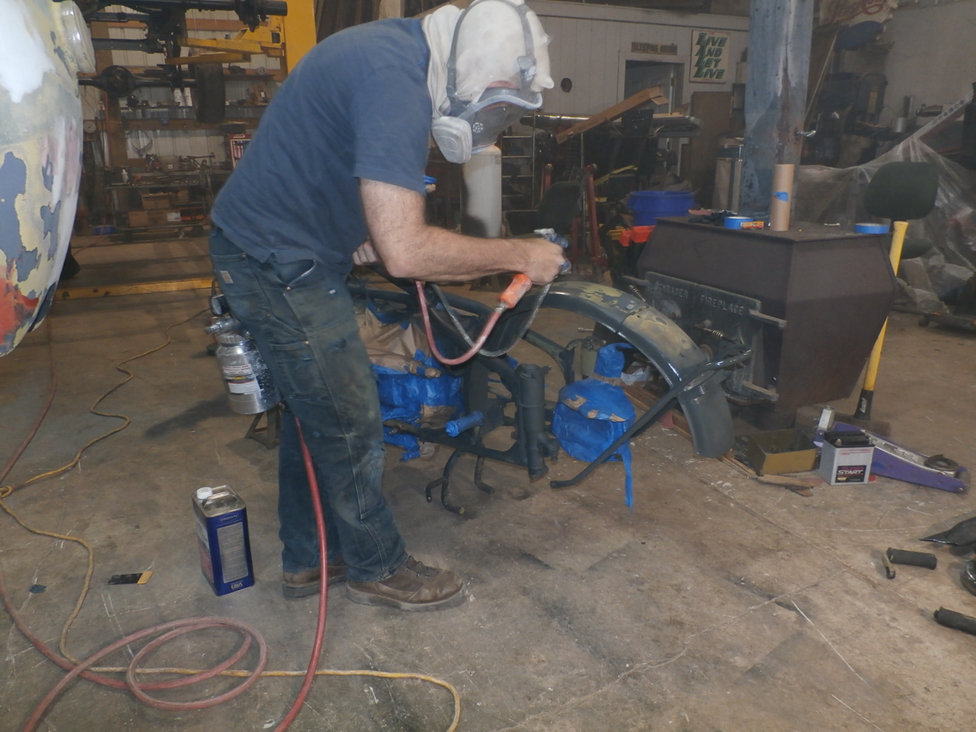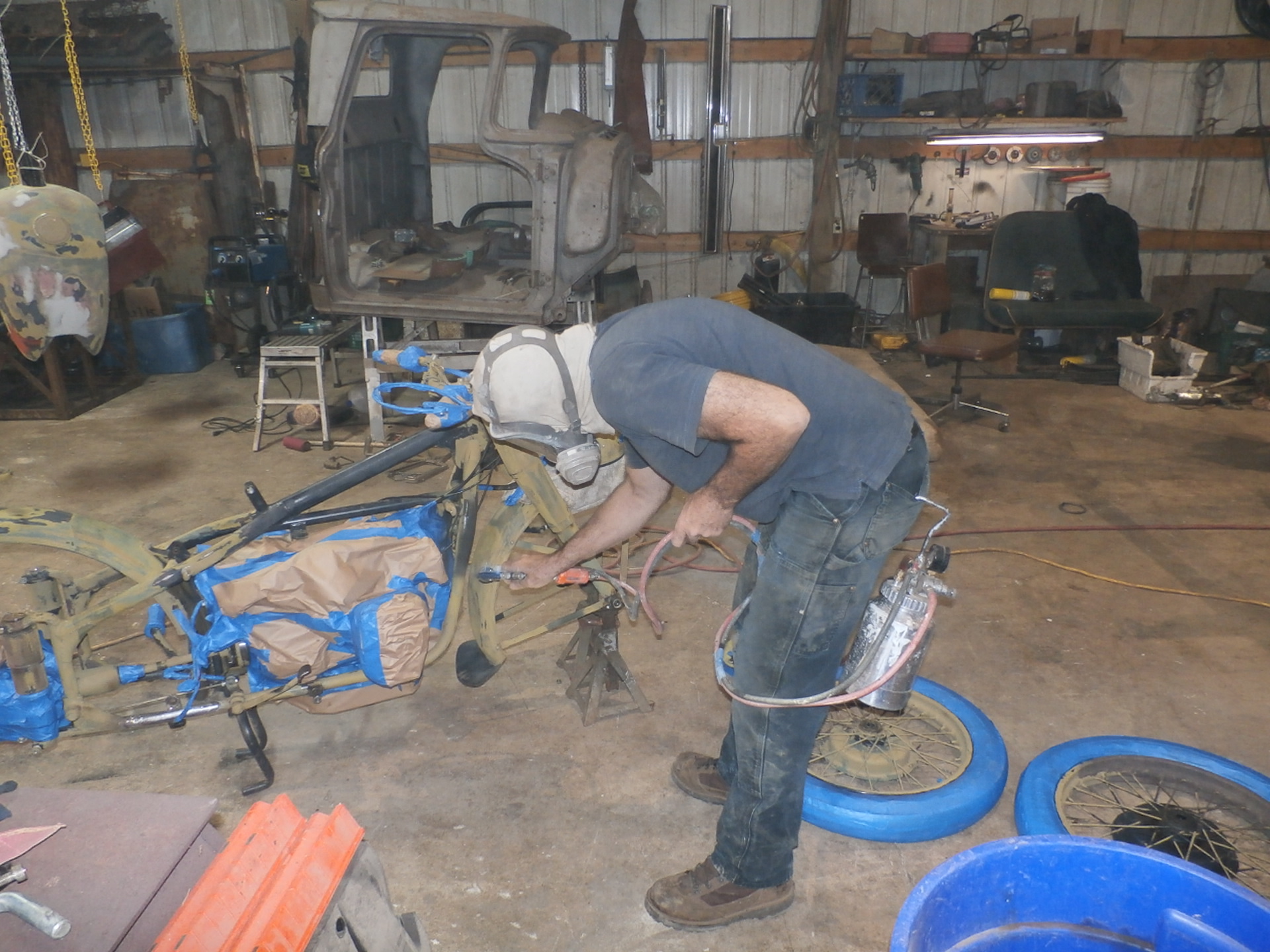 And here, we are re-attaching the side-car to the frame of the motorcycle, with the help of an older padded blanket placed over the pallet for protection of the new paint.